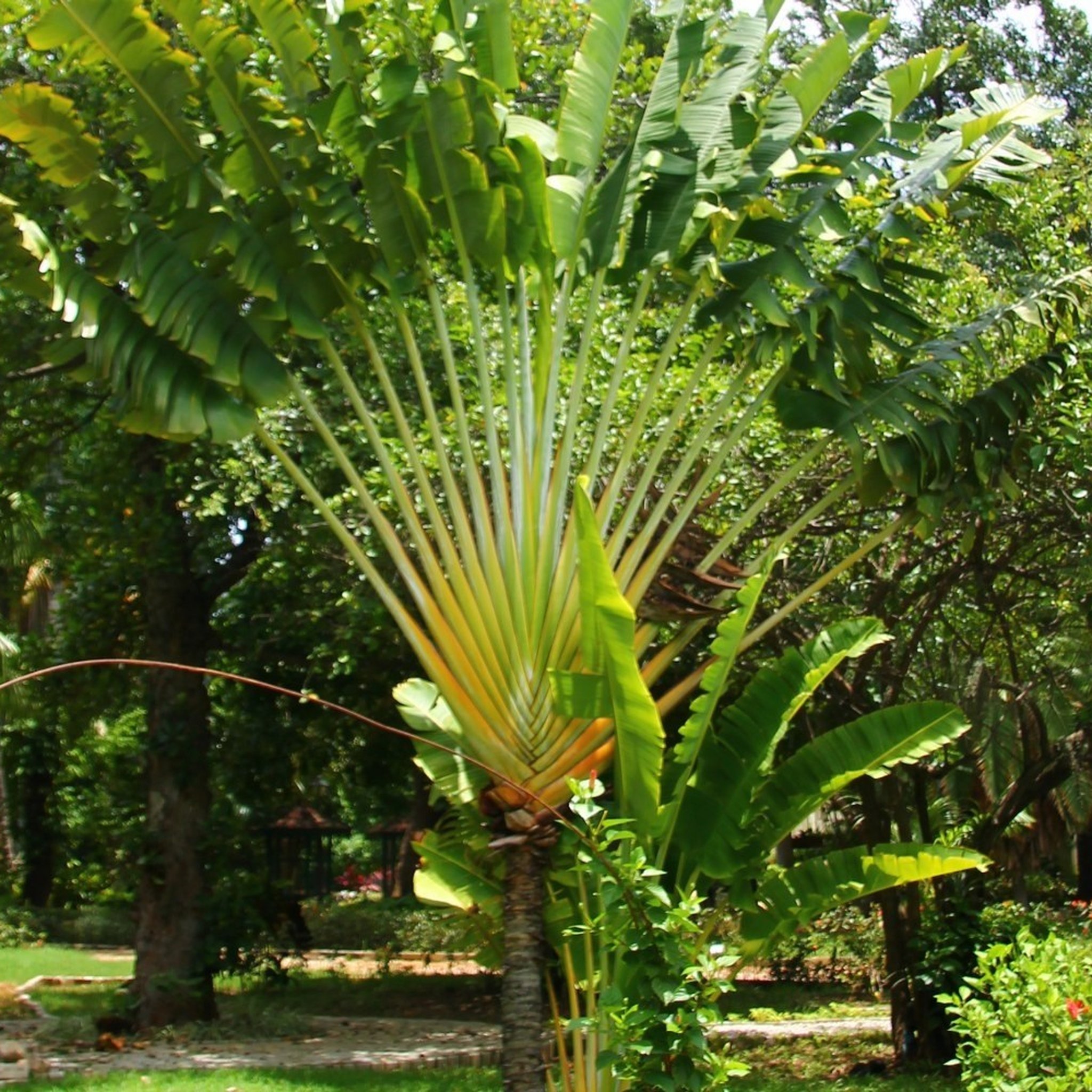 Mit dem Baum des Reisenden (Ravenala madagascariensis) ziehst du eine der eindrucksvollsten Tropenpflanzen der Welt selbst aus dem Samen heran. Riesige bananenähnliche Blätter in einer flachen Ebene angeordnet bilden den charakteristischen Fächer. An der Basis jedes Blattes sammelt sich Regenwasser — ein natürliches Reservoir, dem die Art ihren Namen verdankt.