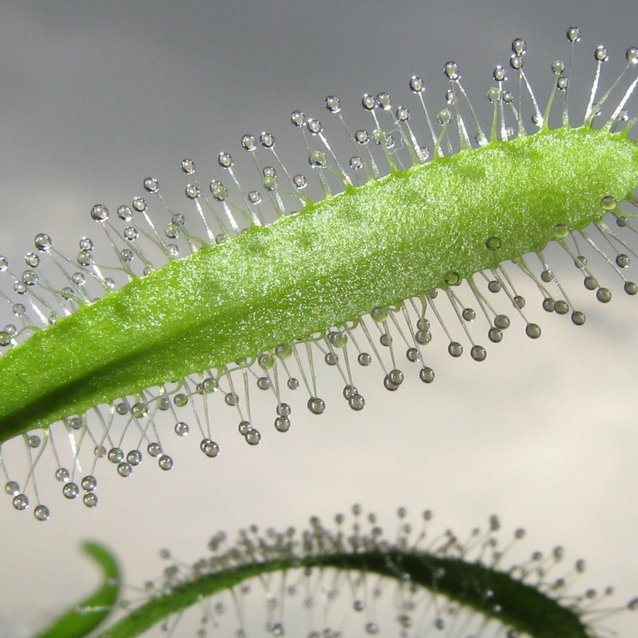 Tentacles secrete sticky mucilage — insects stick, the plant rolls them in and digests over 1-2 weeks.