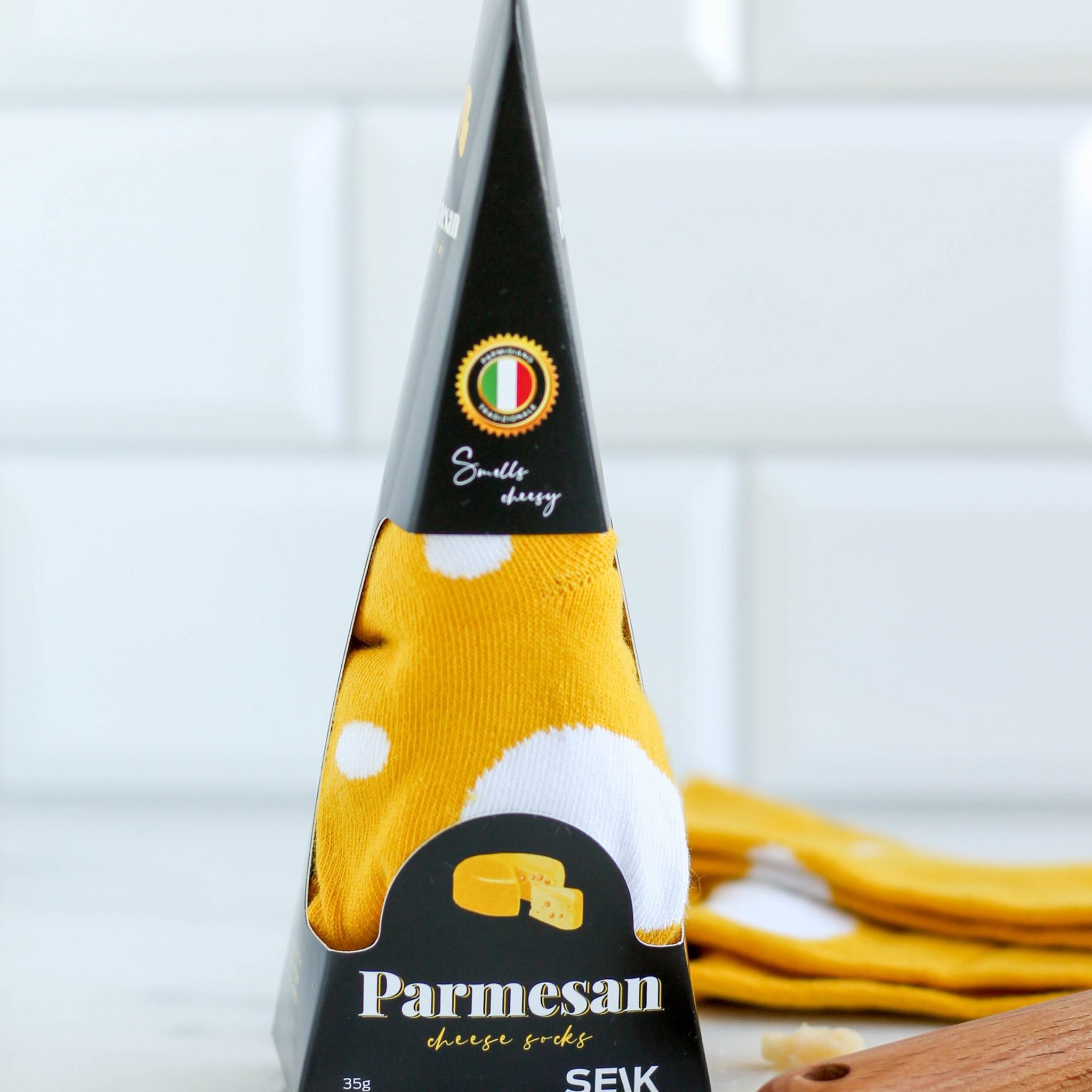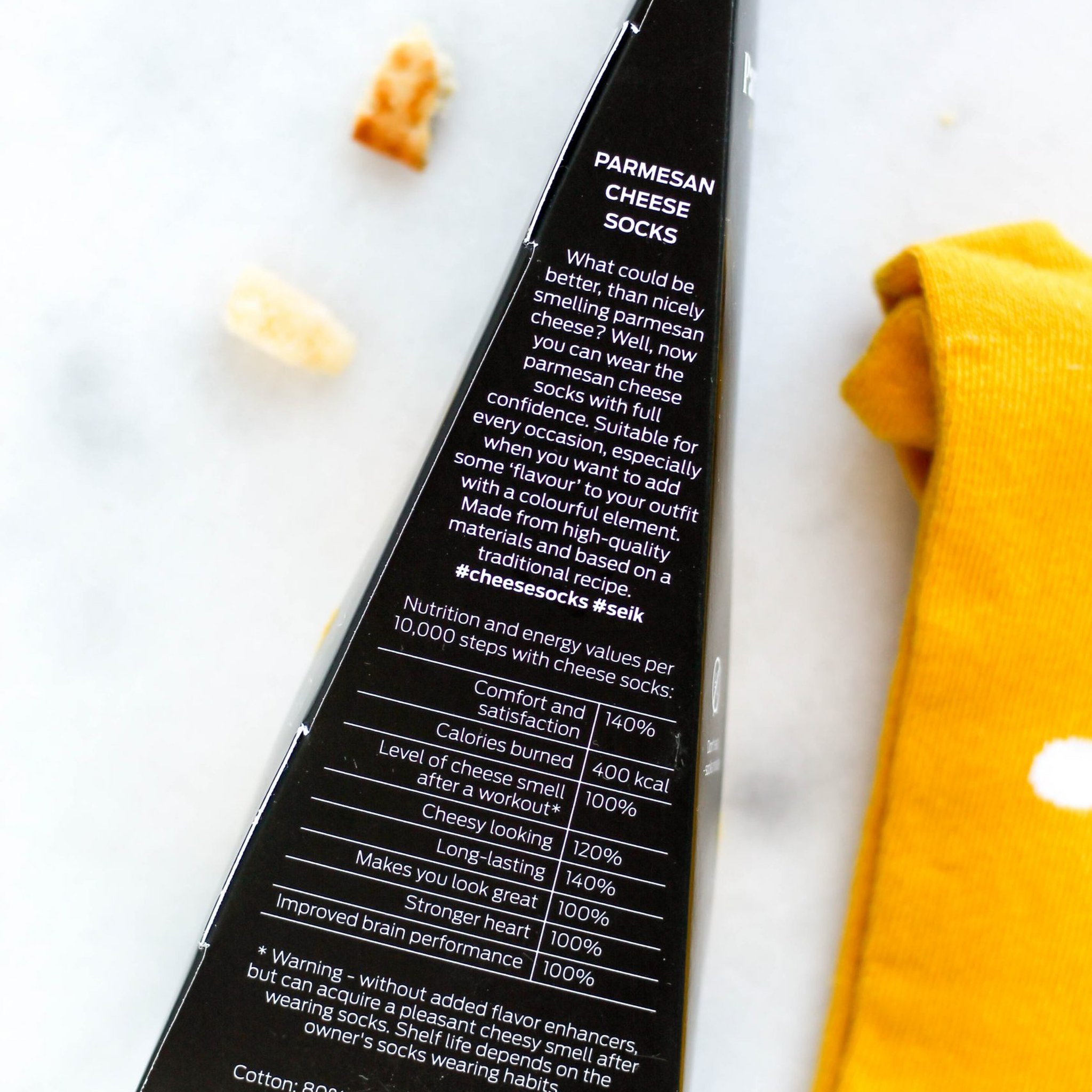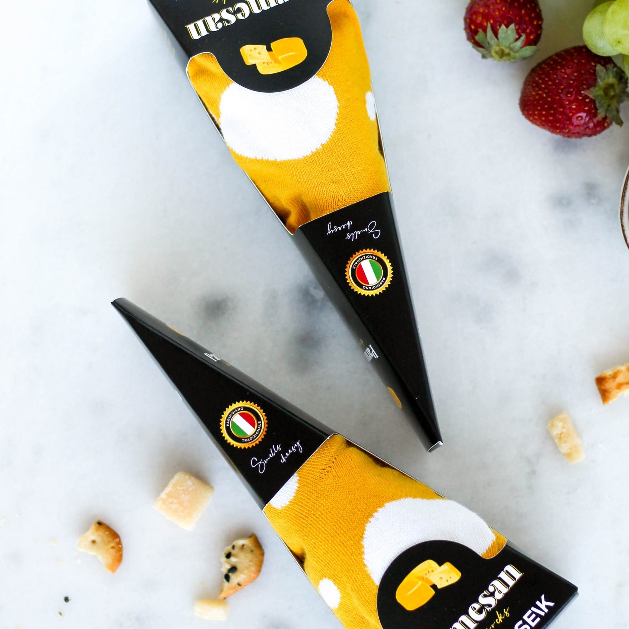 Avec les Chaussettes Parmesan, tu peux donner un twist fromager à ton style, mais sans l'odeur désagréable !
