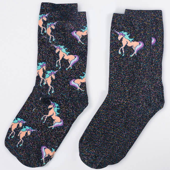 Das Set besteht aus zwei Paar glitzernden Socken mit unterschiedlichen Einhorn-Prints in einer wunderschönen Geschenkverpackung.