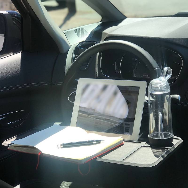 Platoto trasforma la vostra auto in un ufficio itinerante o in un luogo accogliente e confortevole dove pranzare. Platoto è una tavola di legno che può essere fissata al volante della vostra vettura in un secondo.