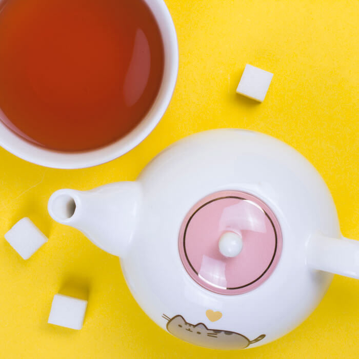 Die Kanne passt perfekt auf die Tasse und kann platzsparend im Küchenregal verstaut werden. Das Set ist mit Pusheen und jeder Menge goldener Details verziert. Das perfekte Geschenk für alle Tee- und Katzenliebhaber!